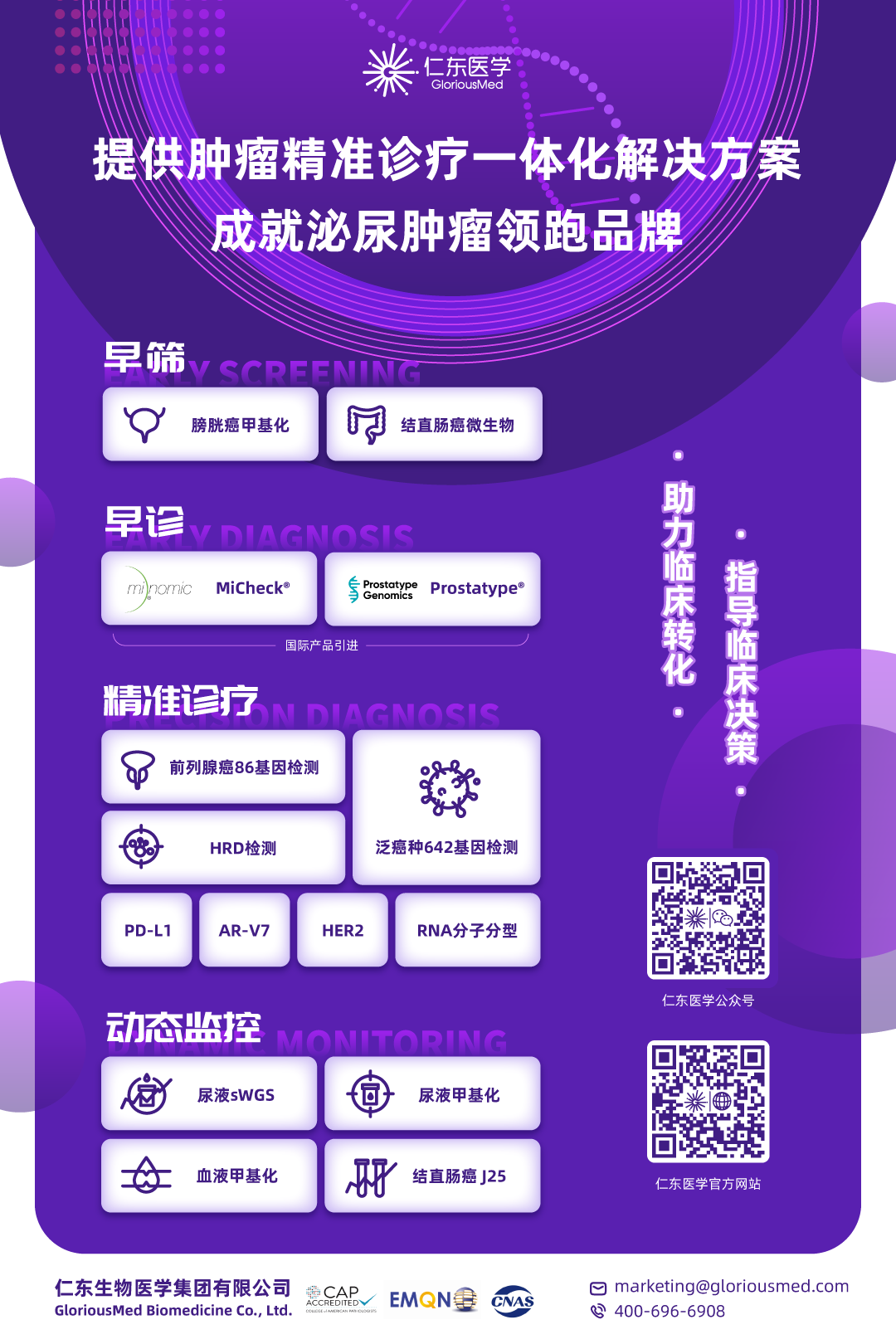 仁东医学是一家以NGS技术为核心,提供垂直瘤种精准诊疗一体化解决方案的高新技术企业,总部位于苏州市吴中区,拥有近6000m2医学检验实验室及1,000+m2的GMP生产基地;研究院机构及互联网医院平台。公司业务已覆盖了全国29个主要省市的逾1,000家医院,并与3,000多位临床专家达成长期合作关系。 仁东医学作为肿瘤精准诊疗领军企业,依托于特有的基因检测技术平台和其他多组学多维度平台,坚持用先进可靠的技术为临床服务,通过自主研发和国际合作引进的创新产品和技术服务,聚焦垂直瘤种的临床应用和转化研究,助力临床决策。在泌尿肿瘤(前列腺癌、膀胱癌、肾癌)领域形成了完善的解决方案,市场认可度和占有率遥遥领先。 仁东医学运营管理团队经验丰富,成员皆有业界先进科研院所和企业的从业经验。技术和产品研发团队成员来自中科院、同济大学、罗氏诊断、华大基因、赛默飞等机构,业务开拓团队成员来自于罗氏、默克等优秀企业,研究院主要核心成员包括同济大学博士生导师、中科院杰青、全军肿瘤免疫研究所教授、匹兹堡大学教授等专家。 仁东医学注重结合临床诊疗的痛点需求和公司技术开发能力,专注打造细分癌种精准诊疗一体化解决方案闭环。利用自身技术优势和多维度数据挖掘分析能力,和临床专家共同开发特色产品。同时引进国内外前沿科学技术,快速实现临床转化应用,满足临床从早期筛查、辅助诊断到晚期个体化用药的全程管理,提供给临床医生和患者整体解决方案。 针对临床痛点问题仁东医学和临床专家以及药企共同开展科研工作,通过组学与临床表型数据及药物疗效随访数据相结合,不断积累临床检测和科研项目的数据,形成细分癌种领域的完整数据库,探索解决方案。积极搭建临床专家、药企、基础研究专家的学术交流平台,促进精准诊疗理念的传播。推动经过临床研究应用检验过的产品申报注册标准试剂盒,推动产品的标准化应用。展开