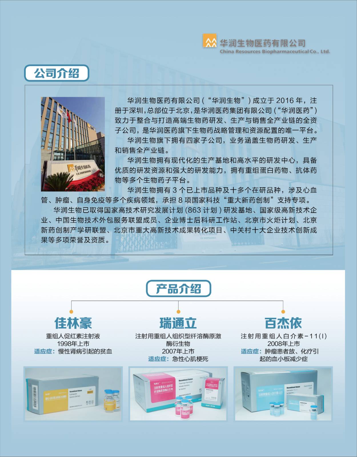 华润医药集团有限公司(3320.HK)是中国领先的综合医药公司,涵盖医药研发、制造、分销等全产业。从事中药、化药、生物药、营养和保健品的生产制造;在滋补类中药、心脑血管、胃肠道和代谢、大输液、抗感染、生殖健康、感冒用药、眼科用药、中药颗粒剂等领域具有市场领先地位。旗下拥有华润医药商业集团、华润三九(000999.SZ)、华润双鹤(600062.SH)、东阿阿胶(000423.SZ)、华润江中(600750.SH)、华润生物医药等知名实体企业。2020年营业收入2004亿港币,整体规模位居中国医药行业前三。 华润生物医药有限公司成立于2016年,注册于深圳,总部位于北京,是华润医药集团有限公司致力于整合与打造高端生物药研发、生产与销售全产业链的全资子公司,是华润医药旗下生物药战略管理和资源配置的唯一平台。华润生物致力于高端生物制药研发、生产、销售全产业链的整合和运营,拥有现代化的生产基地和高水平的研发中心,具备优质的研发资源和强大的研发能力。目前拥有蛋白质类药物、抗体类药物等多个生物药物子平台,产品线包含3个已上市产品,4个临床阶段产品,2个IND阶段产品,3个临床前产品;覆盖肿瘤、心脑血管、血液系统、代谢、眼科等领域,承担国家科技“重大新药创制”支持项目8项。华润生物已取得国家高技术研究发展计划(863计划)研发基地、国家级高新技术企业、中国生物技术外包服务联盟成员、企业博士后科研工作站等多项荣誉及资质。 华润生物(天津)公司作为华润生物的专业医药营销平台,业务范围及人员架构涉及医药市场准入、产品市场策略制定、全国学术推广、商业渠道管控、销售队伍效力管理等医药市场营销领域商业化团队核心模块,共有专业化全职员工200人,其中管理人员30人。销售网络覆盖全国31个省份,设有12个销售大区、30个代表处。现已达成合作三级以上医院755家,三级以下医院1000余家。展开