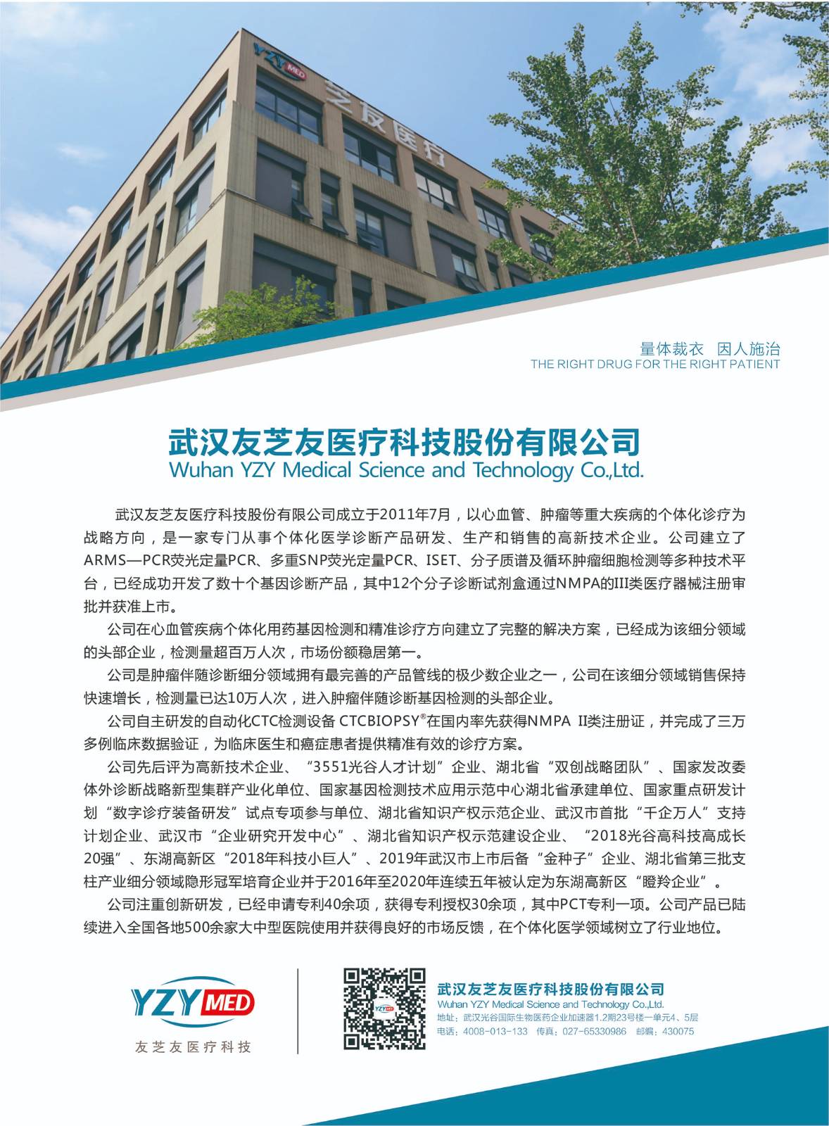 武汉友芝友医疗科技股份有限公司成立于2011年7月,以心血管、肿瘤等重大疾病的个体化诊疗为战略方向,是一家专门从事个体化医学诊断产品研发、生产和销售的高新技术企业。公司建立了ARMS—PCR荧光定量PCR、多重SNP荧光定量PCR、ISET、分子质谱及循环肿瘤细胞检测等多种技术平台,自主研发生产了指导心脑血管疾病个体化用药的分子诊断产品,指导肿瘤诊疗的伴随诊断产品以及循环肿瘤细胞检测产品,为精准医疗提供临床诊断依据。2014年以来,公司已经成功开发了数十个基因诊断产品,其中12个分子诊断试剂盒通过NMPA的III类医疗器械注册审批并获准上市。