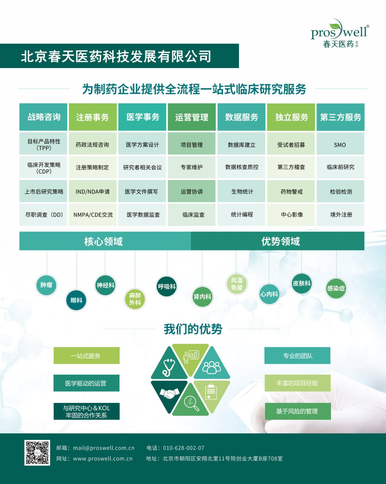 北京春天医药科技发展有限公司(以下简称“春天Proswell”)成立于2004年,致力于医药事业的发展,以创建中国CRO的国际品牌,推动中国CRO的健康发展为己任。 春天Proswell为制药及医疗器械公司提供法规事务、医学事务、临床运营管理、受试者招募、数据管理、统计分析、第三方稽查、药物警戒、中心影像等临床研究的全流程一站式临床研究服务。 春天Proswell拥有丰富的组织、管理临床试验的经验,经过17年的发展,临床研究项目覆盖了肿瘤、神经、血液、眼科、呼吸、儿科、内分泌、心血管等众多领域,先后在400多家GCP研究中心完成了近500项临床研究管理工作,超过80000名受试者参与了春天Proswell的临床研究。 春天Proswell临床试验的质量管理体系通过了中国质量认证中心(CQC)的ISO9001:2015 GB/T19001-2016认证(证书编号:00116Q31463R2M/1100),成为国内CRO公司中首家通过国际质量体系认证并稳定运行至今的CRO,确保临床试验符合ICH-GCP,中国GCP的要求。 官网:https://www.proswell.com.cn 电话:400-618-0207展开